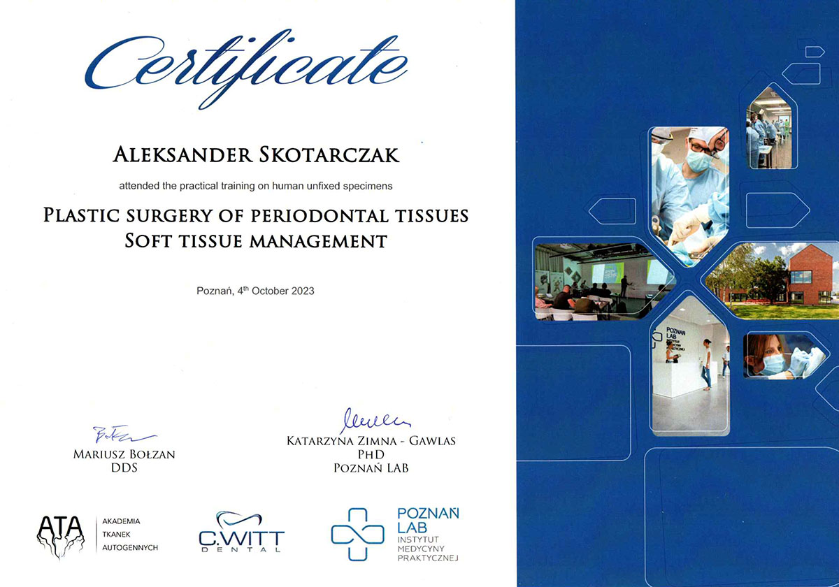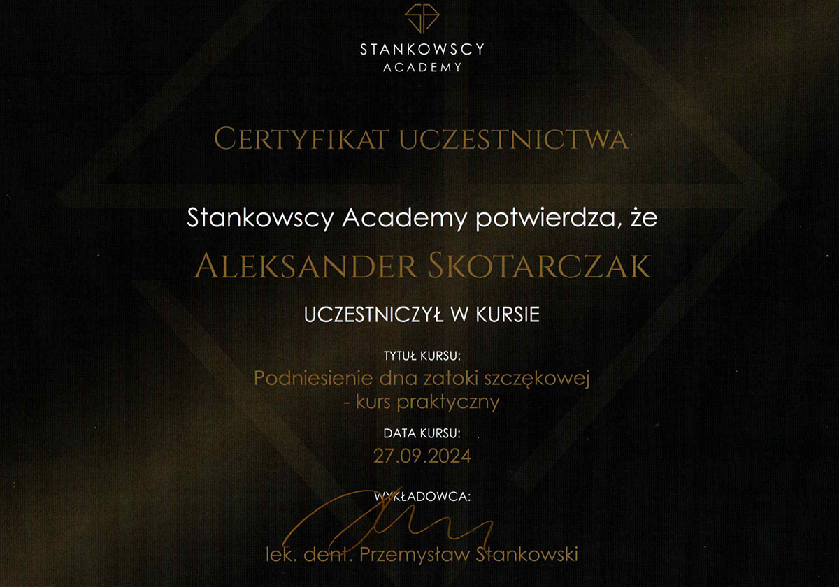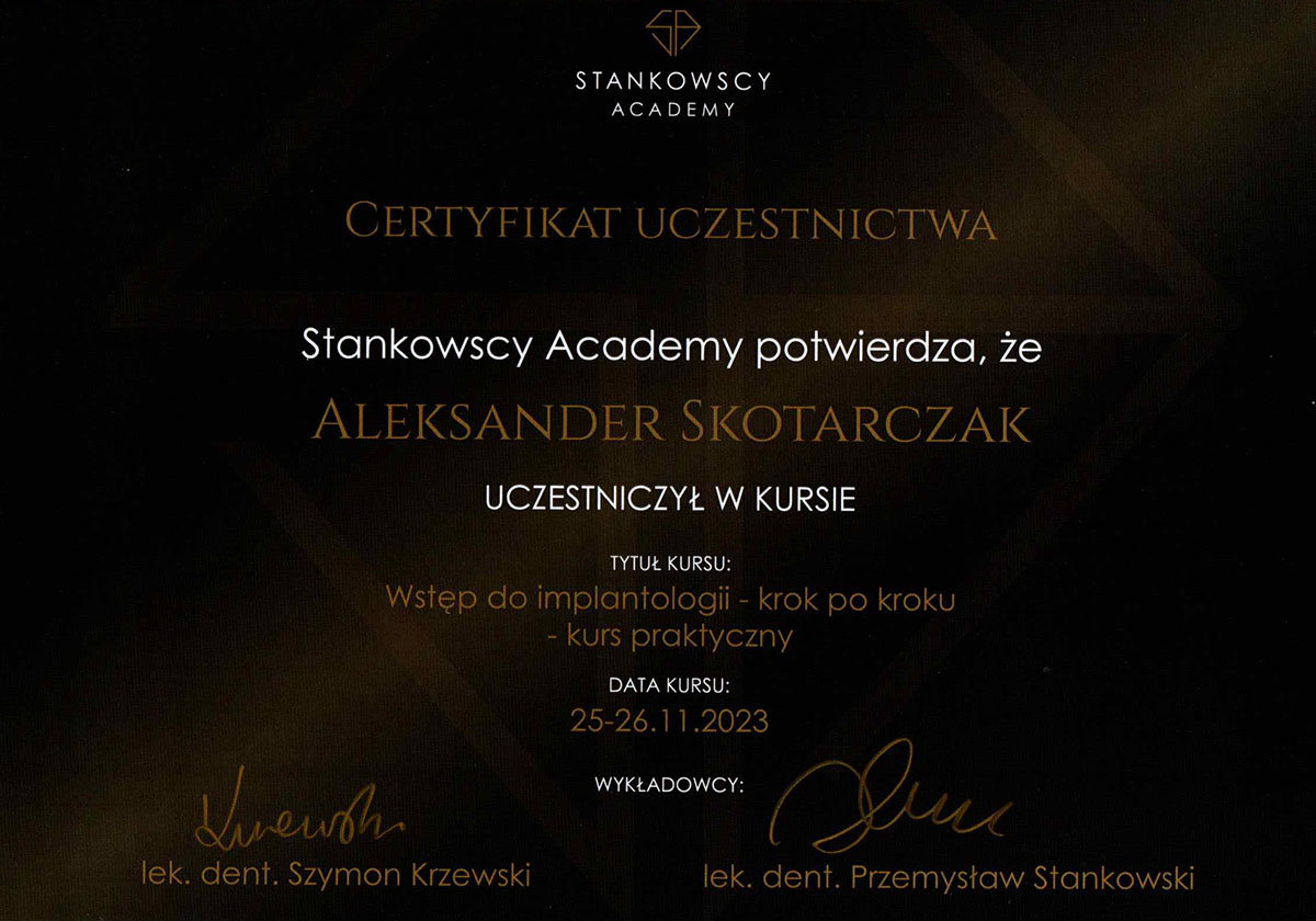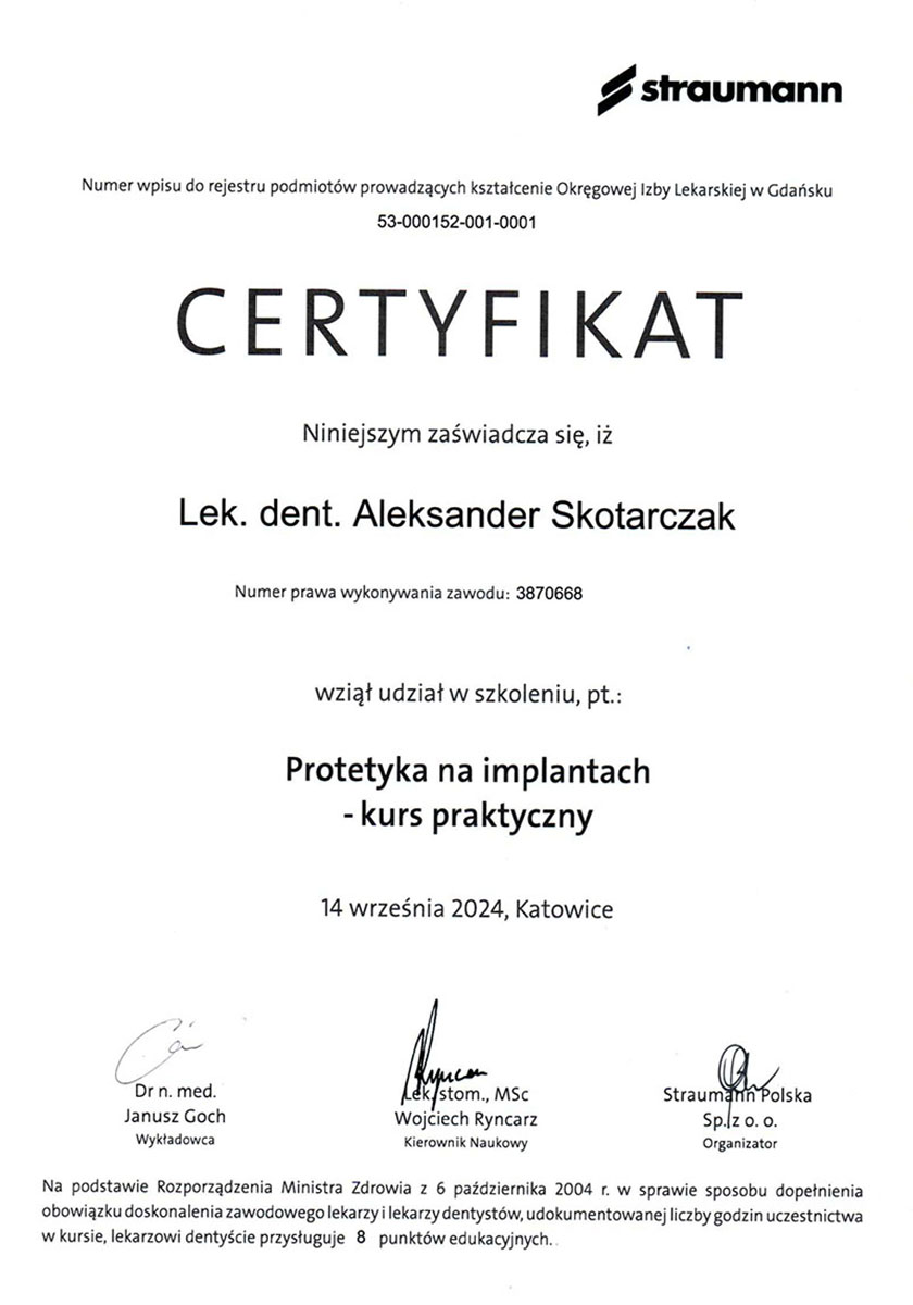 Ukończył Uniwersytet Medyczny w Poznaniu, gdzie do dnia dzisiejszego pracuje jako wykładowca w katedrze protetyki i przygotowuje studentów do wykonywania zawodu. W naszym gabinecie zajmuje się leczeniem pacjentów w szerokim zakresie. Wykonuje uzupełnienia protetyczne jak protezy, korony, mosty , licówki. Jego pasją jest chirurgia stomatologiczna i to właśnie zgłębianie wiedzy z tej dziedziny daje doktorowi najwięcej satysfakcji. Jego ,,konikiem” jest usuwanie zatrzymanych ósemek, których z powodzeniem wyjął już ogromne ilości. Fascynuje doktora również implantoprotetyka, uzupełniając implantami pojedyncze braki zębowe lub wykonując protezy całkowite mocowane na implantach. W codziennej pracy wykorzystuje mikroskop stomatologiczny, co zwiększa dokładność i precyzję leczenia.