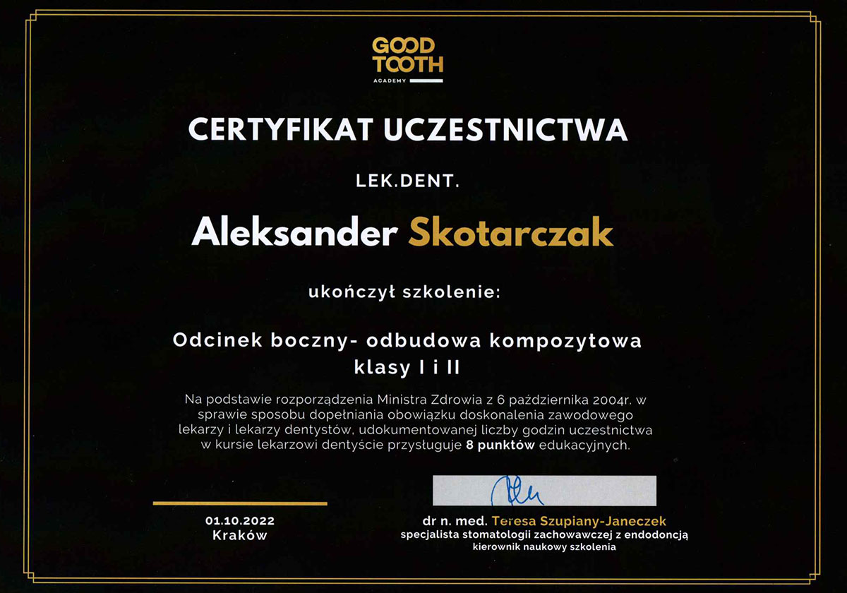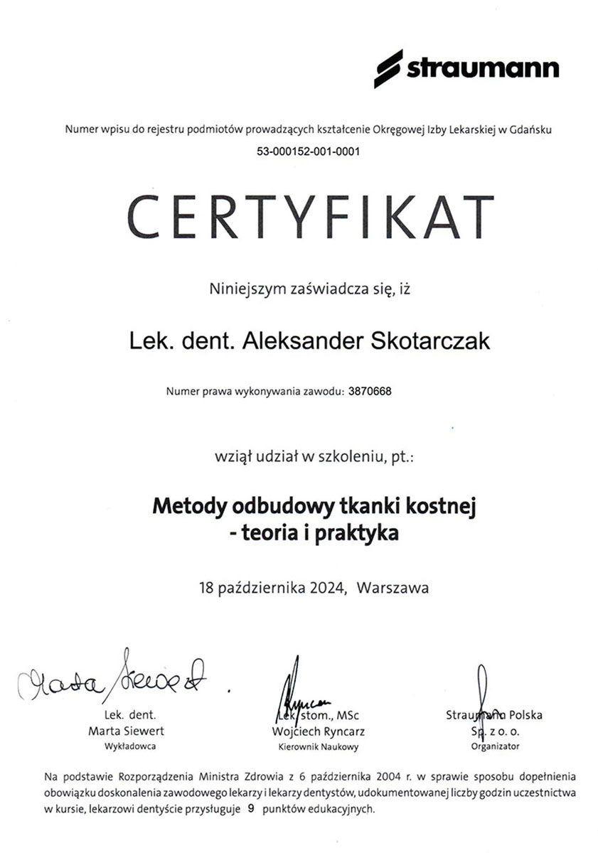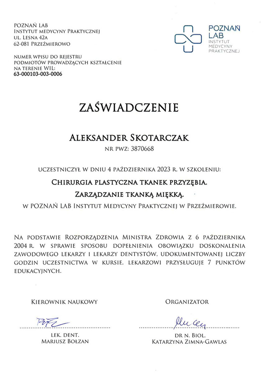 Ukończył Uniwersytet Medyczny w Poznaniu, gdzie do dnia dzisiejszego pracuje jako wykładowca w katedrze protetyki i przygotowuje studentów do wykonywania zawodu. W naszym gabinecie zajmuje się leczeniem pacjentów w szerokim zakresie. Wykonuje uzupełnienia protetyczne jak protezy, korony, mosty , licówki. Jego pasją jest chirurgia stomatologiczna i to właśnie zgłębianie wiedzy z tej dziedziny daje doktorowi najwięcej satysfakcji. Jego ,,konikiem” jest usuwanie zatrzymanych ósemek, których z powodzeniem wyjął już ogromne ilości. Fascynuje doktora również implantoprotetyka, uzupełniając implantami pojedyncze braki zębowe lub wykonując protezy całkowite mocowane na implantach. W codziennej pracy wykorzystuje mikroskop stomatologiczny, co zwiększa dokładność i precyzję leczenia.