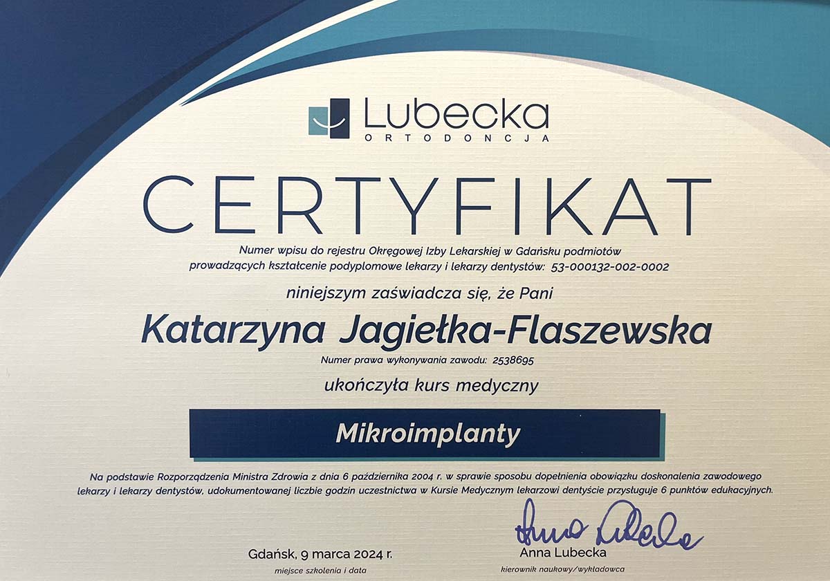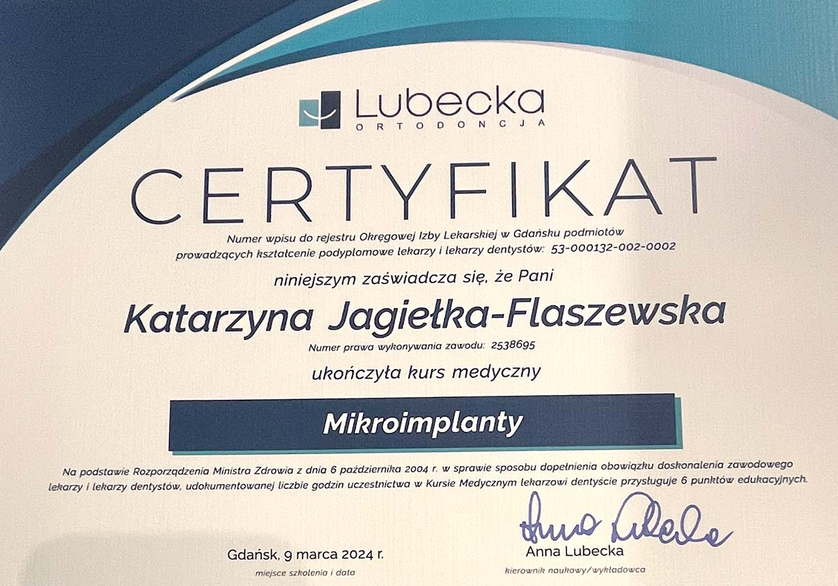 W roku 2009 ukończyła studia na Wydziale Lekarskim II Uniwersytetu Medycznego w Pozaniu, uzyskujac tytuł lekarza dentysty. Od roku 2010 współtworzy poradnię stomatologczną w Lubaszu (woj. wielkopolskie). W roku 2018 ukończyła studia podyplomowe Medycyna Estetyczna dla Lekarzy na GWSH w Katowicach. Od roku 2015 realizuje się w dziedzinie ortodoncji, podchodząc do każdego pacjenta holistycznie, wiedząc jak ważne jest wczesne leczenie dzieci w okresie wzrostu twarzy. Swoją wiedzę stale pogłębia, uczestnicząc w licznych kursach i szkoleniach. Uczy się od najlepszych prelegentów m.in. z Polski, Czech, Kanady, USA oraz Włoch. Prywatnie mama dwóch energicznych dziewczynek i szczęsliwa żona. Wolny czas spędza na rowerze lub w ogrodzie.