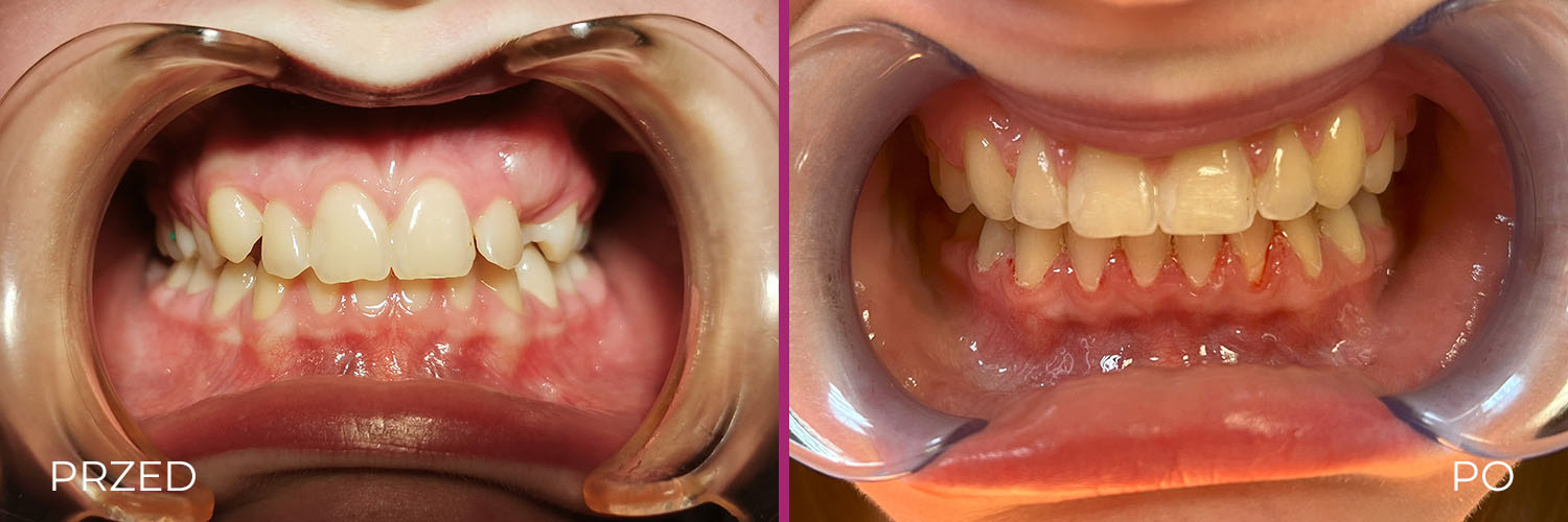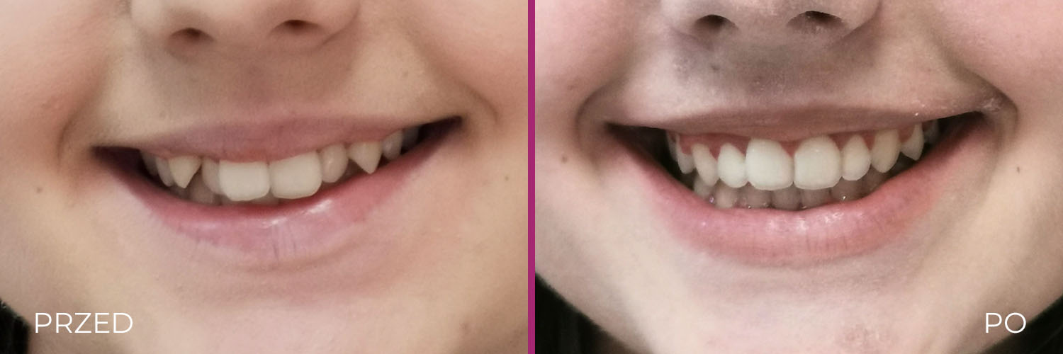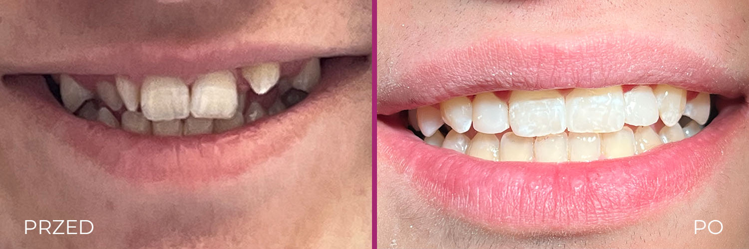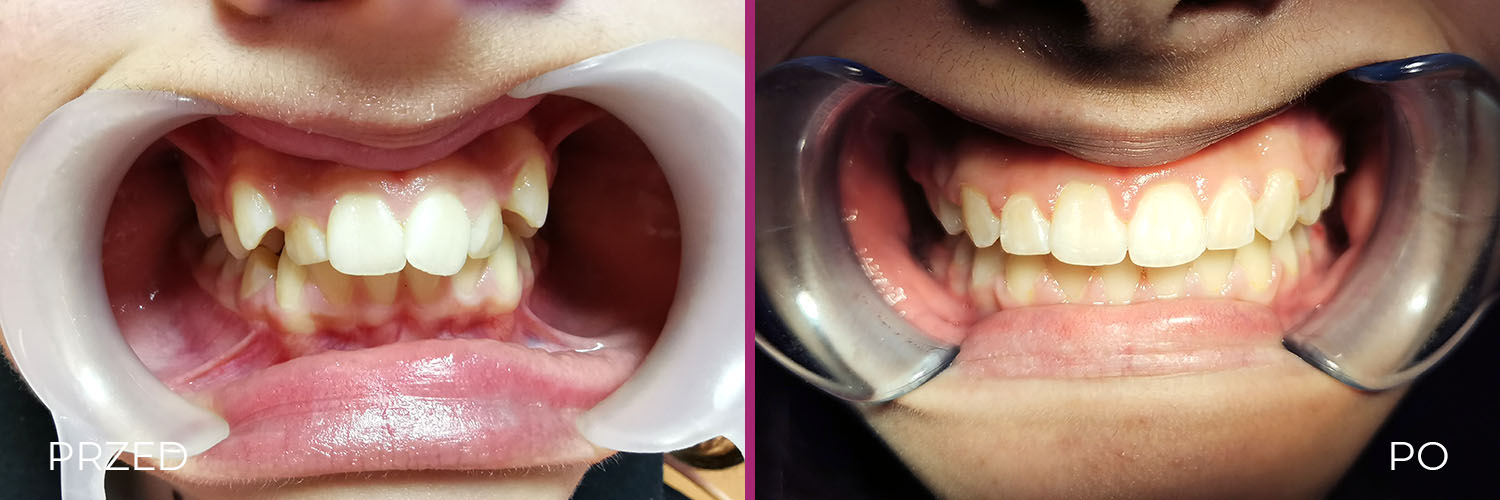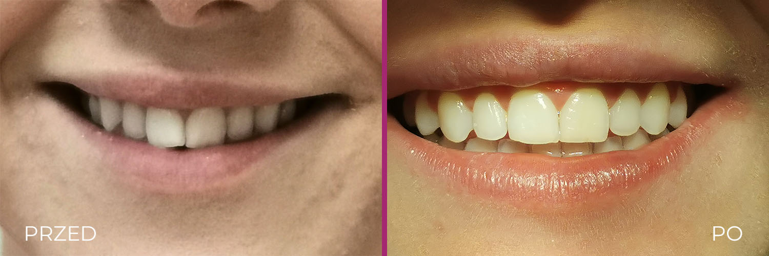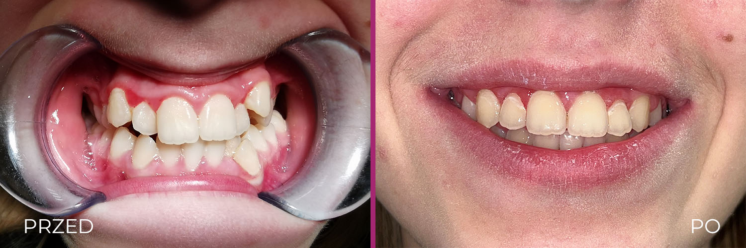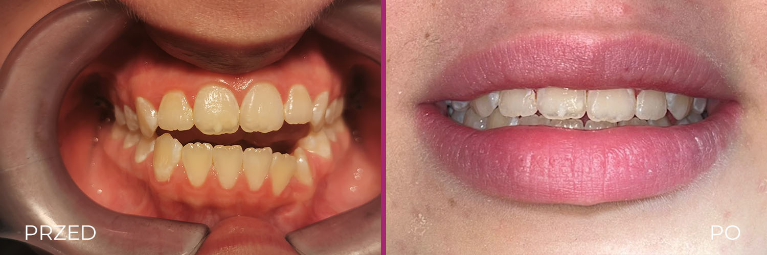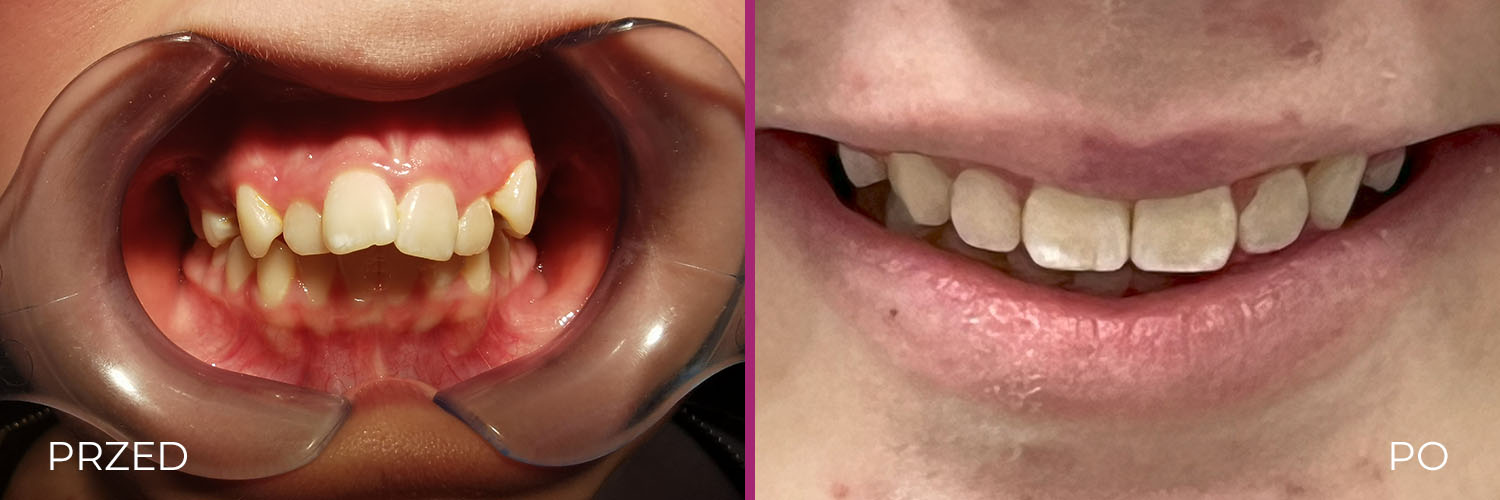 Rezultatem takiego leczenia jest nie tylko piękny szeroki uśmiech bez ekstrakcji zębów, ale również odmłodzenie wyglądu twarzy.