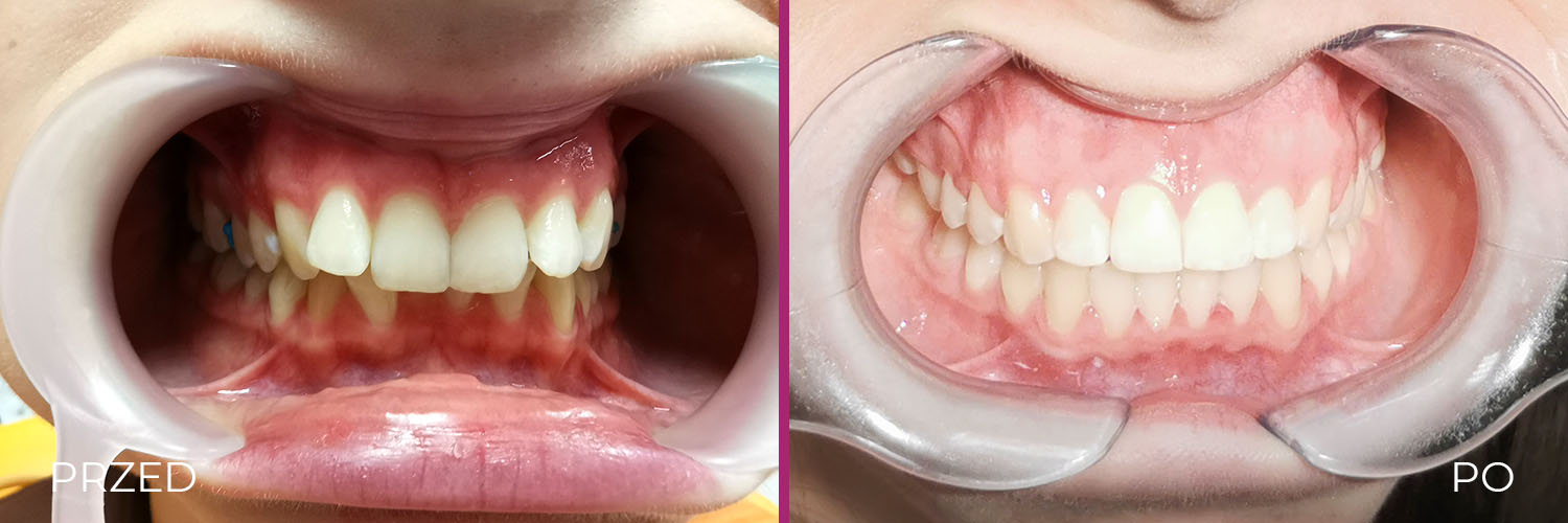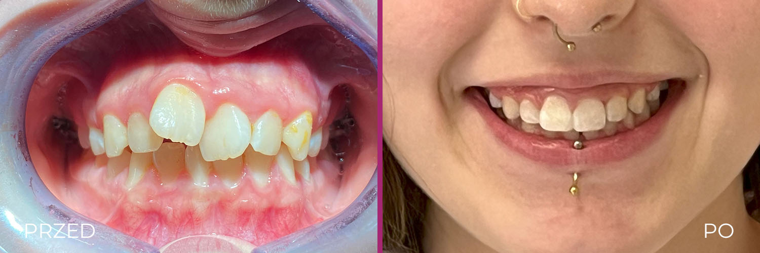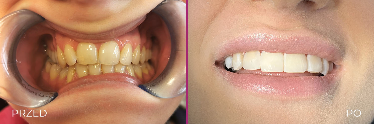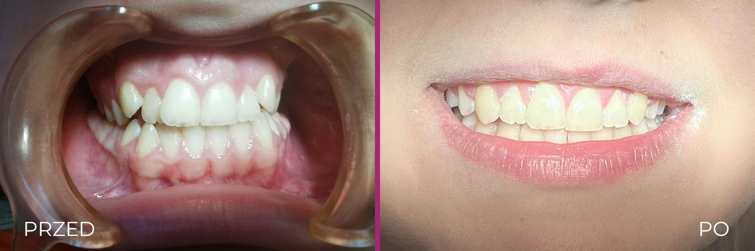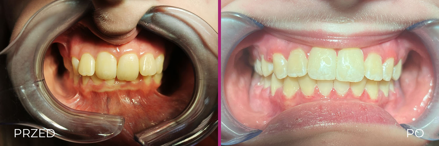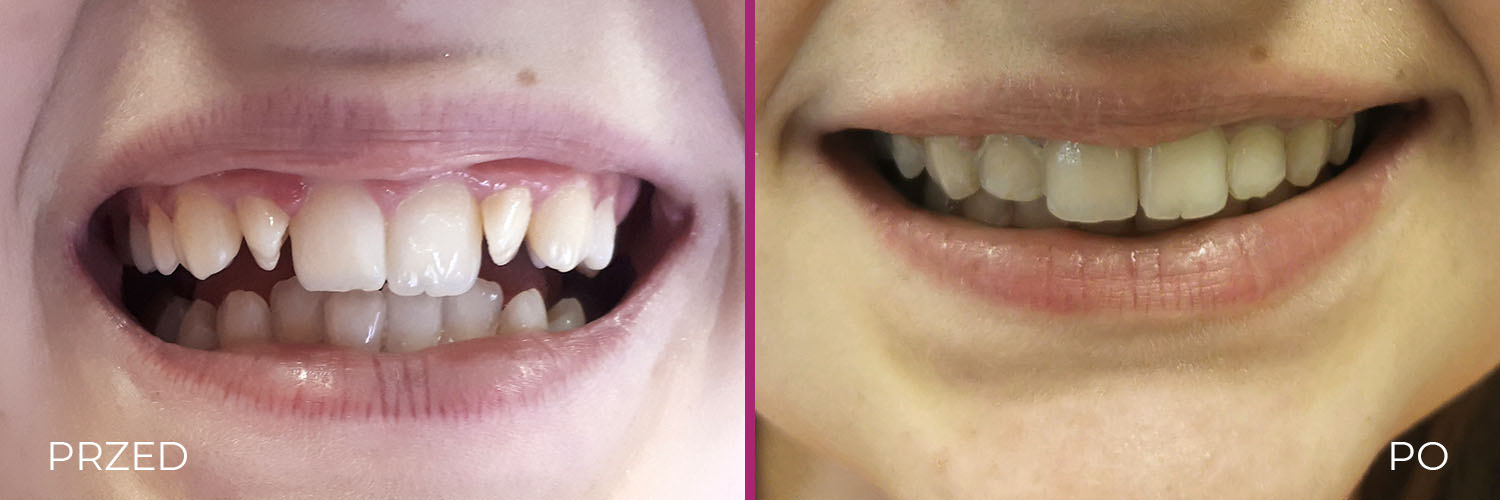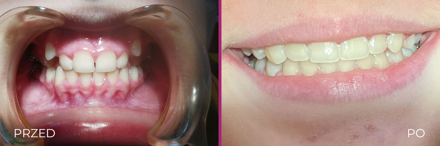 Rezultatem takiego leczenia jest nie tylko piękny szeroki uśmiech bez ekstrakcji zębów, ale również odmłodzenie wyglądu twarzy.